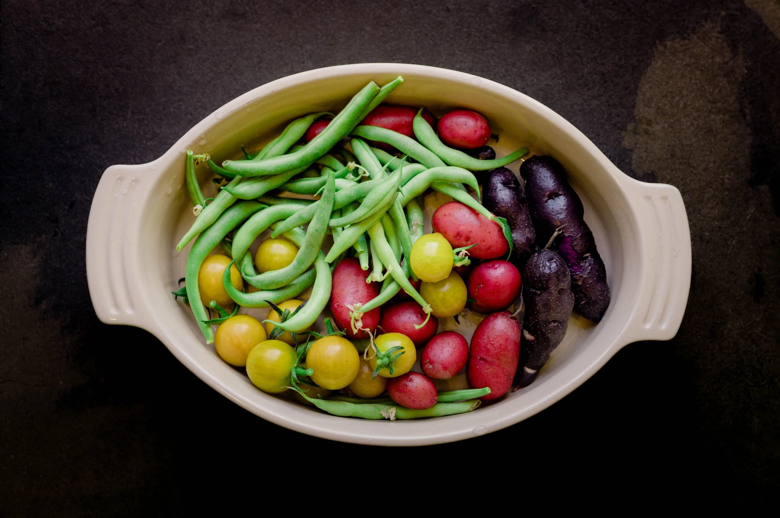 The tomato offers its gift of fiery color and cool completeness.