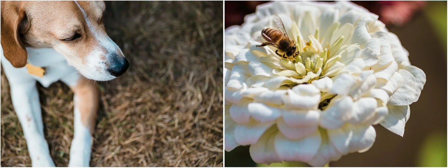 On this beautiful Saturday morning the dog is lazy, and the bees are busy.